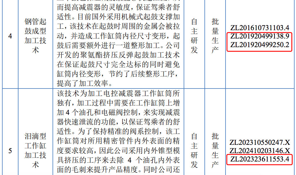 新能源企业领域产品创新方面,根据招股书披露,公司生产的电控减震器多孔管件是较早量产并应用于国产新一代半主动、主动减震器的核心产品之一,大力推动了该领域国产化的进程。公司参与了客户天纳克(TENNECO)电控减震器配套部件的开发过程,形成相关先进技术,产品最终供应于理想等新能源汽车品牌。