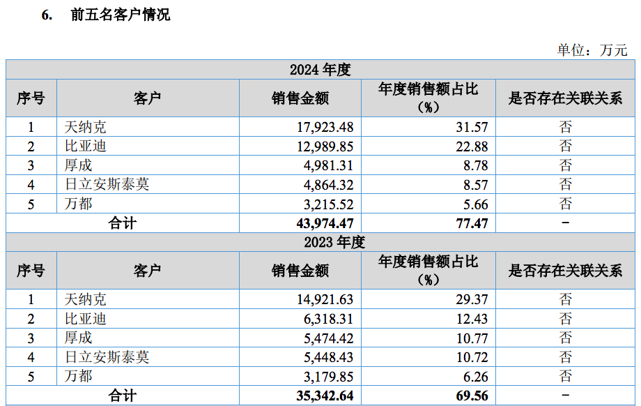 从前五大客户看,天纳克(TENNECO)连续三年一直是公司第一大客户,2024年对其销售额占比在31.57%;比亚迪近两年是公司第二大客户,且公司对其销售金额快速增长,2023年对比亚迪销售额为6318万元,2024年为1.3亿元,同比增长一倍,销售额占比增至22.88%。