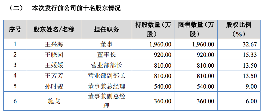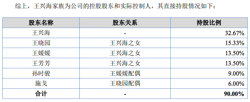 持股情况方面,王兴海及3个女儿、2个女婿共计直接持股90%,控制公司95.00%的股份表决权。