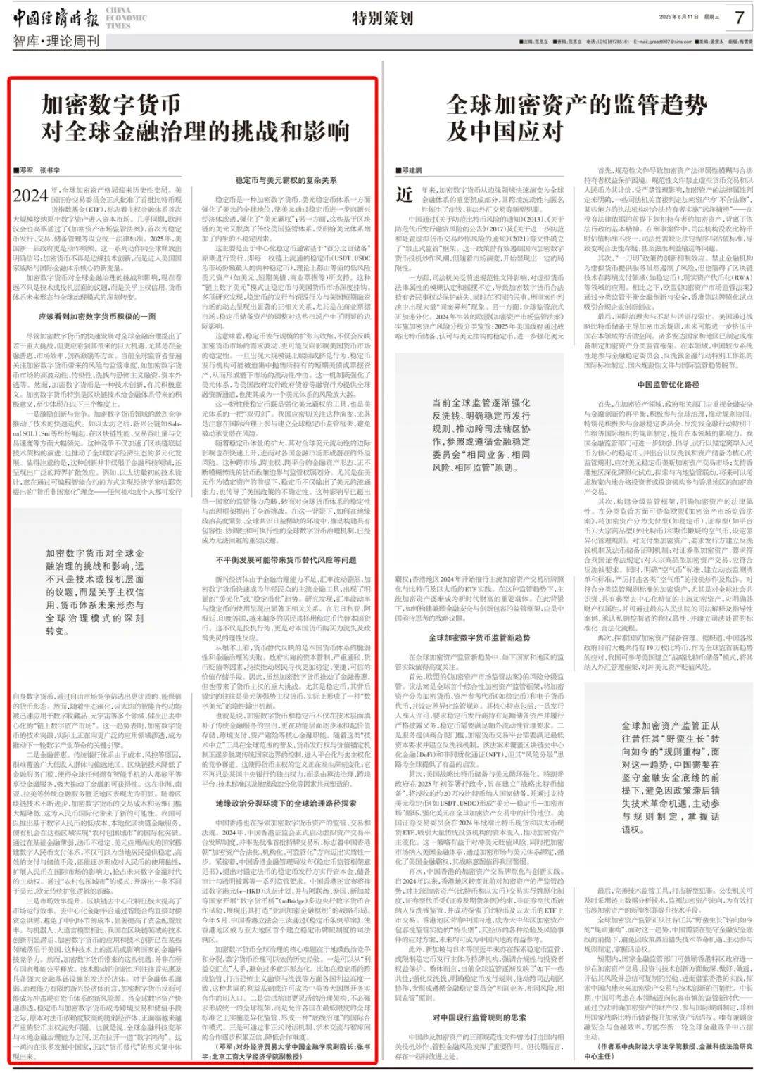 加密数字货币全球治理的核心难题在于地缘政治竞争和分裂,数字货币治理可以效仿历史经验。一是可以从“利益交汇点”入手,避免过多意识形态化。比如在稳定币的跨境监管、打击恐怖主义融资与洗钱等方面各国利益高度一致,这种共同的利益基础或许可成为中美等大国展开务实合作的切入口。二是尝试构建更灵活的治理架构,不必强求形成统一的全球框架,而是允许各国在最低限度的全球标准之上实施差异化监管,形成一种“底线治理”的国际合作模式。三是可通过非正式对话机制、学术交流与智库间的合作逐步积累互信,降低合作难度。