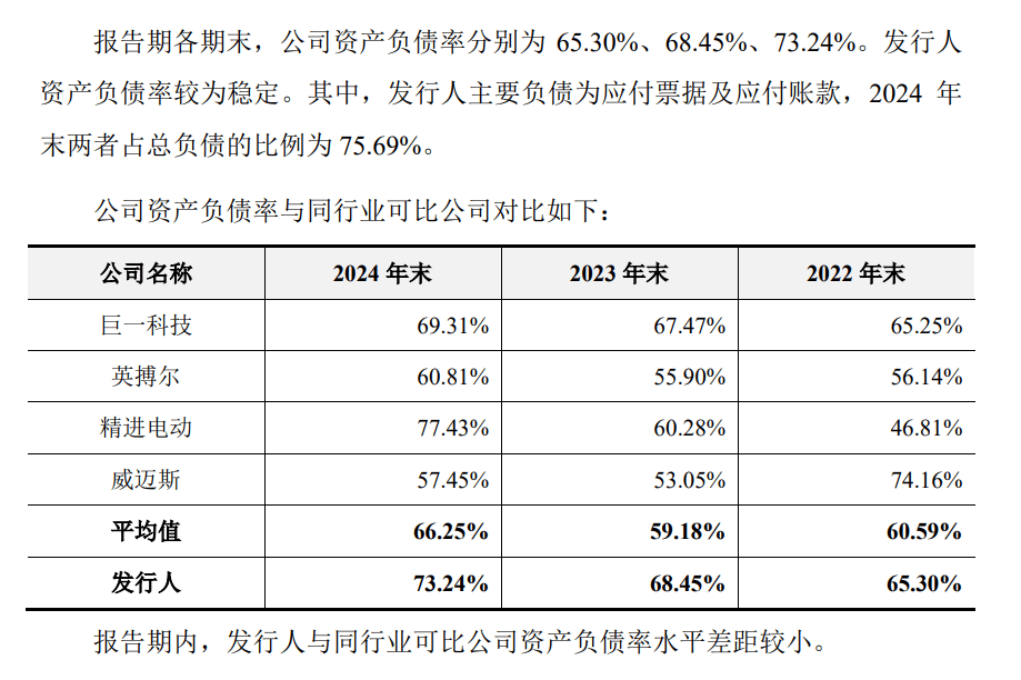 应付类项目的大幅攀升推高了联合动力的资产负债率。报告期各期末,公司资产负债率分别为 65.30%、68.45%和73.24%,均高于可比公司均值;流动比率分别为 1.22 倍、1.16 倍和 1.14 倍,公司资产负债率水平较高,流动比率较同行业上市公司的平均水平偏低。