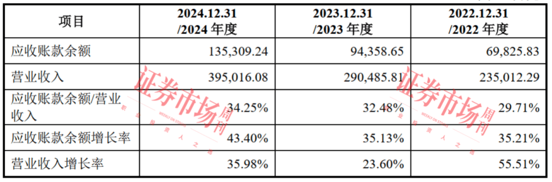 值得一提的是,在友升股份营业收入快速增长的同时,公司的应收账款也在快速增加。 据招股 书披露,报告期各期末,友升股份的应收账款余额分别为6.98亿元、9.44亿元和13.53亿元,增长率分别为35.21%、35.13%和43.40%, 应收账款余额占营业收入的比例则相应为29.71%、32.48%、34.25%。2023年和2024年的应收账款规模增速已经超过了同期营业收入的增速。