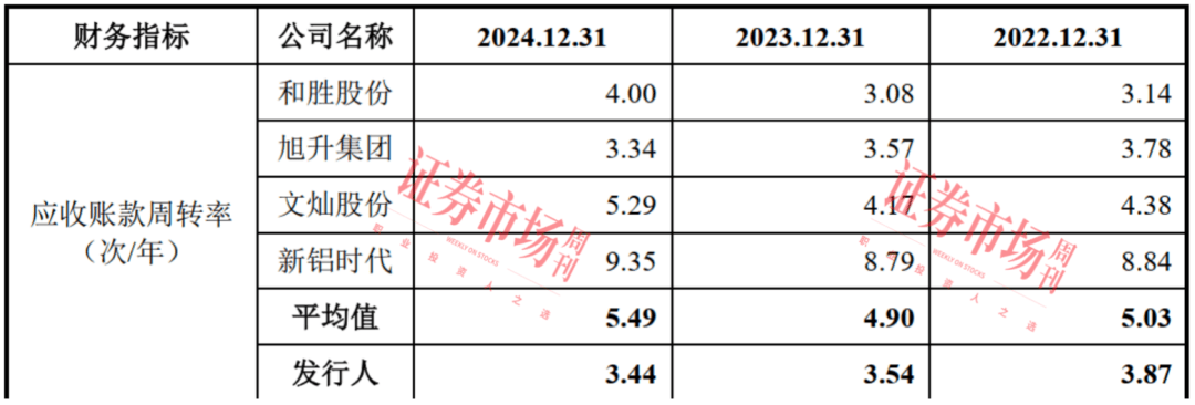 大量应收账款出现,影响到了友升股份的应收账款回款情况。据招股书披露,报告期内,公司的应收账款周转率分别为3.87次/年、3.54次/年和3.44次/年, 周转能力呈现减弱趋势。与同行业公司相比,前文提到的旭升集团、文灿股份、和胜股份、新铝时代四家同行业公司的应收账款周转率均值则分别为5.03次/年、4.90次/年和5.49次/年,明显高于友升股份。