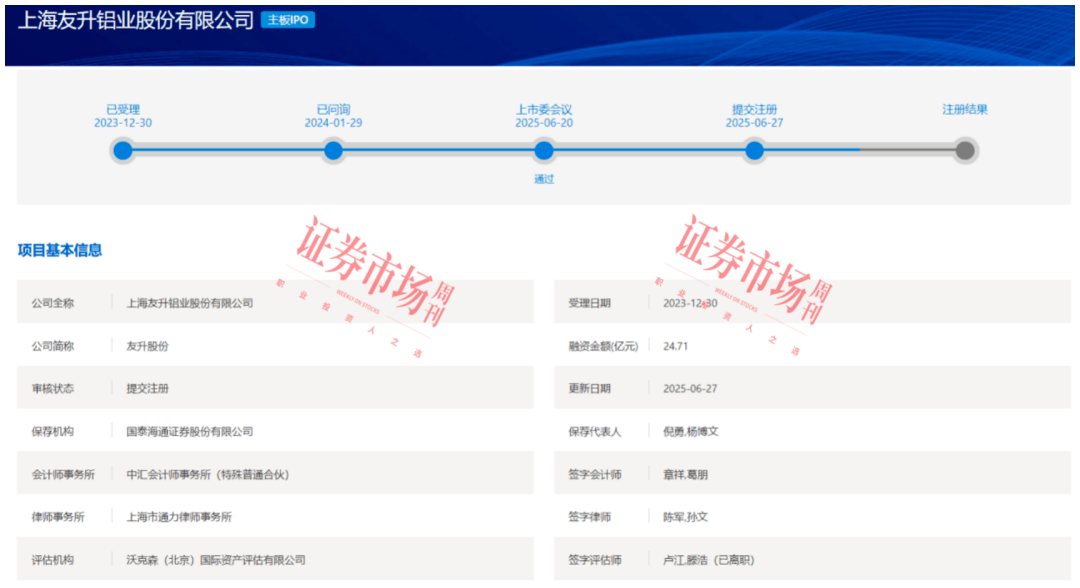 近日,上海友升铝业股份有限公司(以下简称“友升股份”)正式向证监会递交IPO注册申请,距其通过上市委会议审核仅过去一周时间。本次IPO,公司拟计划募集资金24.71亿元,用于云南友升轻量化铝合金零部件生产基地项目(一期)、年产50万台(套)电池托盘和20万套下车体制造项目,以及补充流动资金。友升股份表示,“希望通过本次上市进一步增强公司的资本实力和行业影响力,完善公司治理机制,夯实经营基础,全面提升核心竞争力,致使公司成为全球汽车工业优秀供应商。”