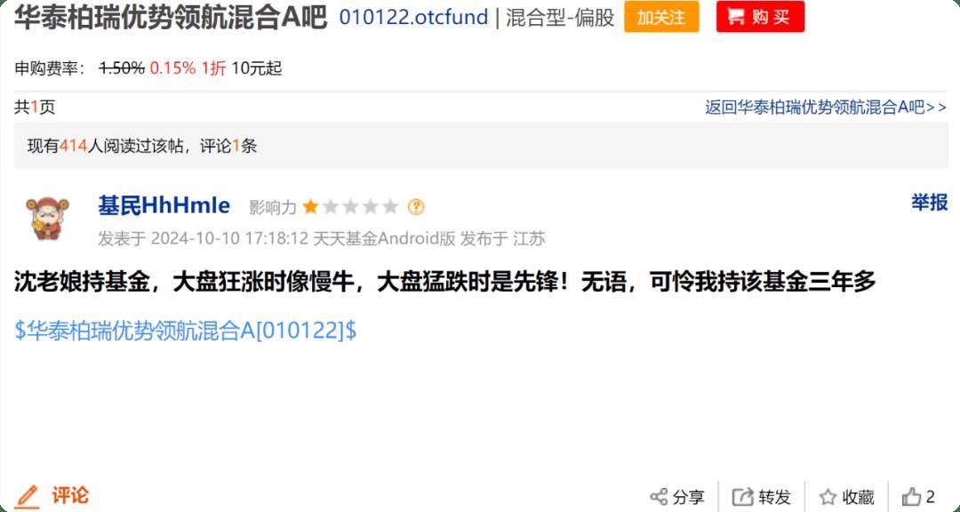 基金业绩下降,有基民自然会抱怨,沈经理的基金,大盘狂涨时像慢牛,大盘猛跌时是先锋!无语,可怜我持该基金三年多。也有基民表示,我真的对这只基金太无语了,大家不要再投这只基金了,完全不会投。甚至有基民表示,这个基金是拿基民钱,我持该基金5年了,还套着呢。