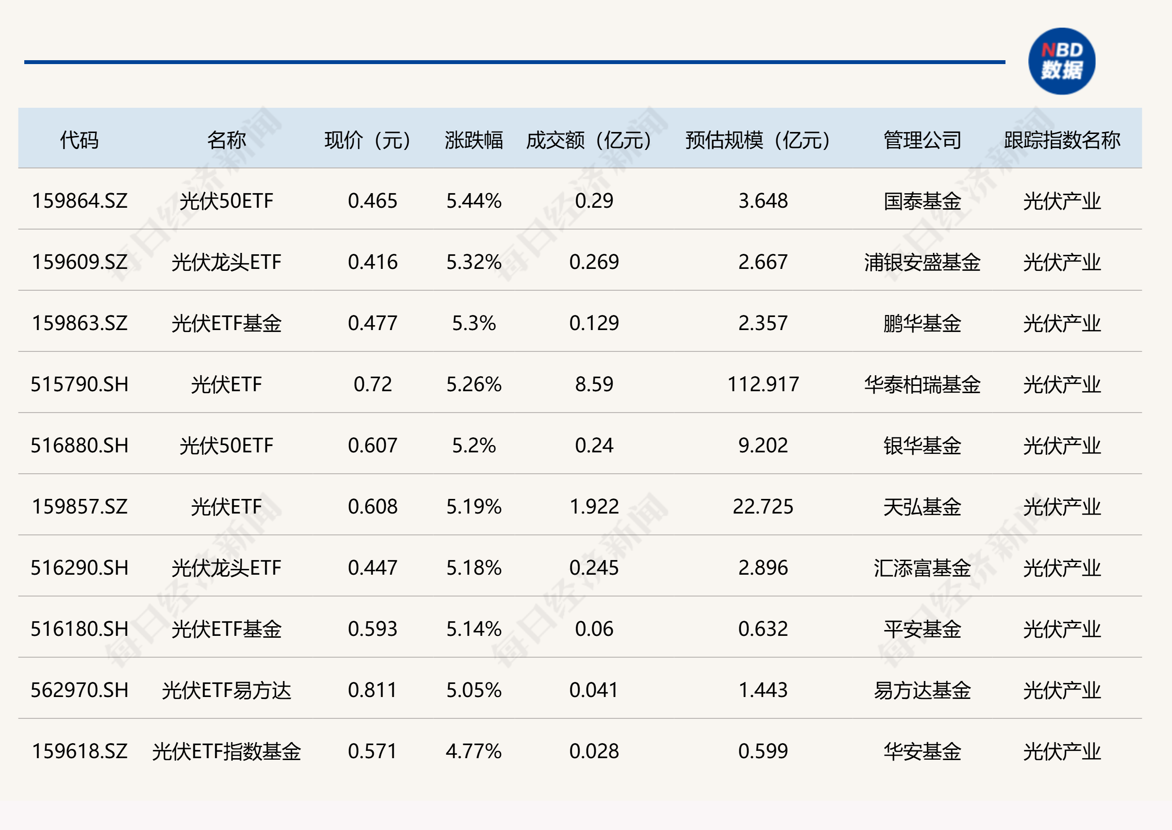 受盘面影响,多只光伏相关ETF早盘大涨逾5%。