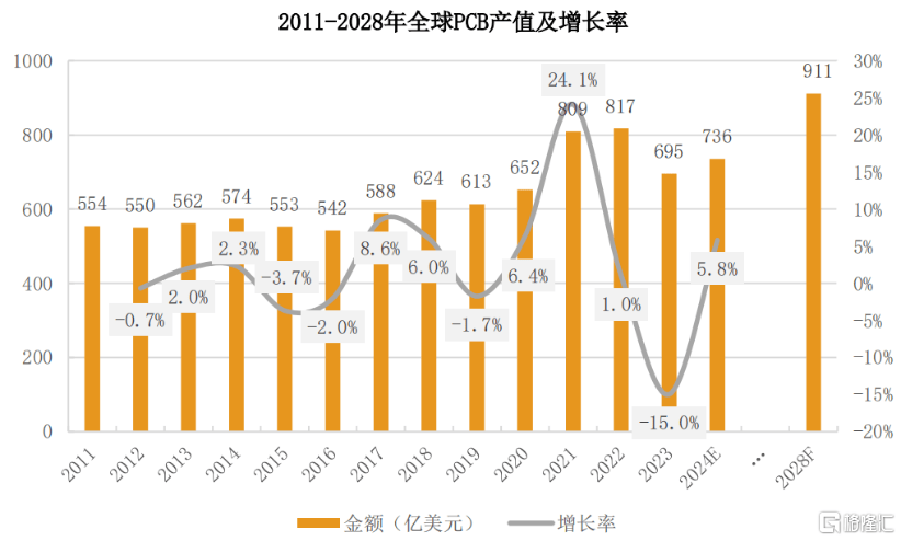 2011-2028年全球PCB产值及增长率,来源:招股书
