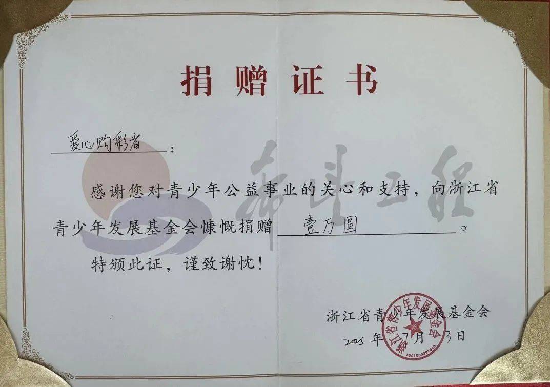 近日,杨先生特意“打飞的”重返浙江,领取这份沉甸甸的幸运。领奖后,他当场向浙江省青少年发展基金会捐赠了10000元爱心善款。“买彩票本就是随手公益,现在中奖了,更该回馈社会,希望能帮助到有需要的孩子们。”他真诚地表示。