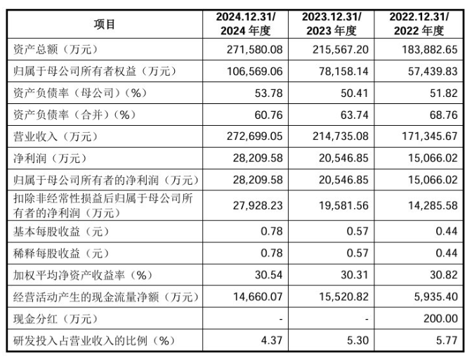 财务方面,于2022年度、2023年度、2024年度,大明电子实现营业收入约为人民币17.13亿元、21.47亿元和27.27亿元;同期,公司实现净利润分别为约人民币1.51亿元、2.05亿元、2.82亿元。