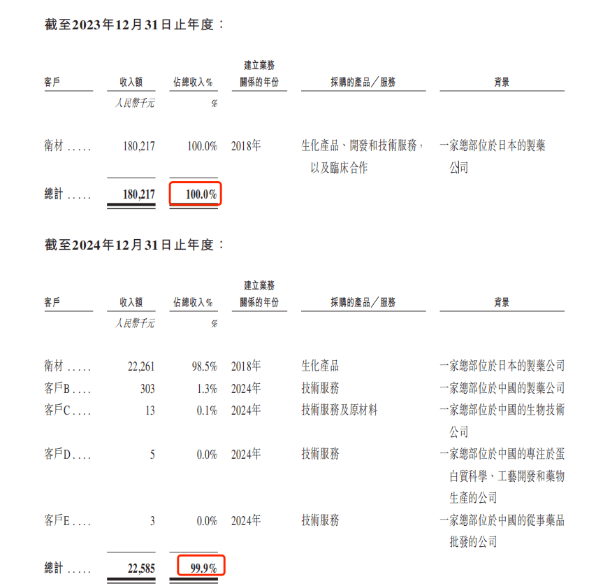 百力司康的收入主要来自与卫材的临床试验合作开发协议,包括收取的里程碑付款,以及提供临床试验材料和研发相关服务的收益。2023年及2024年,来自第一大客户卫材收入占比分别为100%及98.5%。