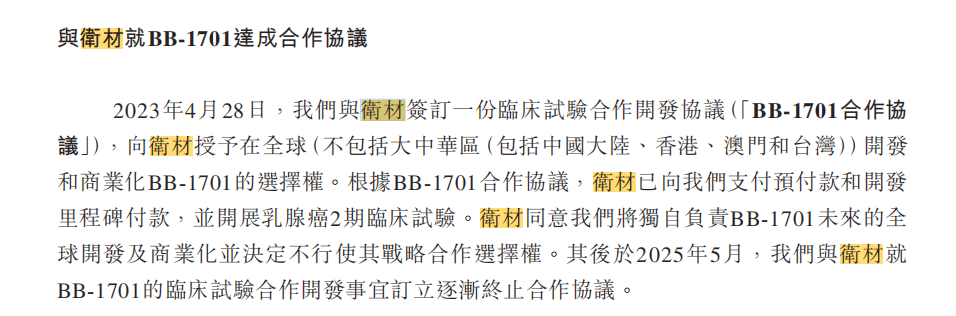 然而2025年5月,双方签署了“逐渐终止合作协议”,未解释原因的终止不仅使20亿美元化为泡影,更切断了公司最大的收入来源。卫材的撤退恰似釜底抽薪,让百力司康的IPO之路陡然布满荆棘。