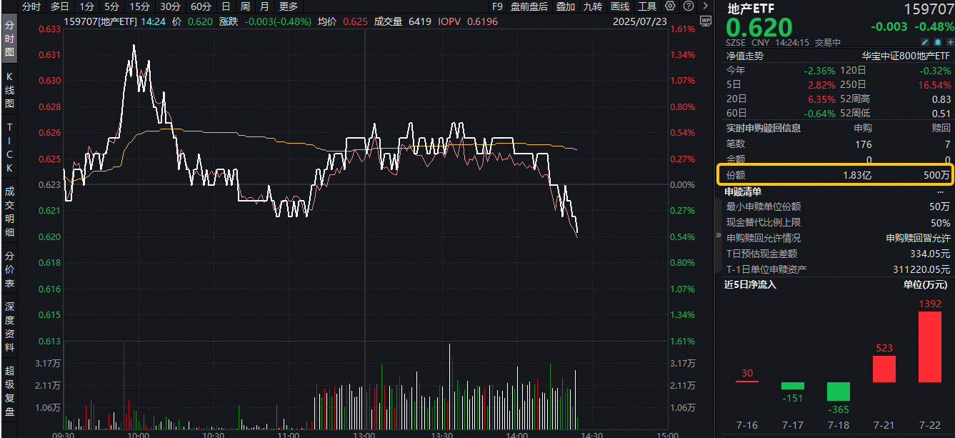 今日(7月23日)布局央国企及优质房企的地产ETF(159707)场内价格一度涨逾1.4%,现跌0.16%,实时成交额达1.45亿元,交投活跃!值得关注的是,该ETF当前已获资金实时净申购超1.7亿份!事实上,此前已连续两日有ETF资金净流入,合计金额1915万元!