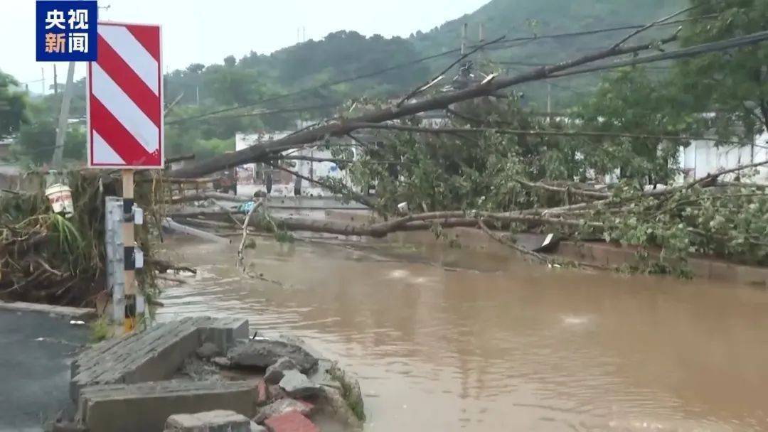 在北京市密云区不老屯镇半城子村,水流非常汹涌,但相比昨晚已经“温柔”了许多。通行的主干道上树木倒伏严重。水淹路面导致水下路面可能存在水毁以及周边山体存在二次滑坡的风险。