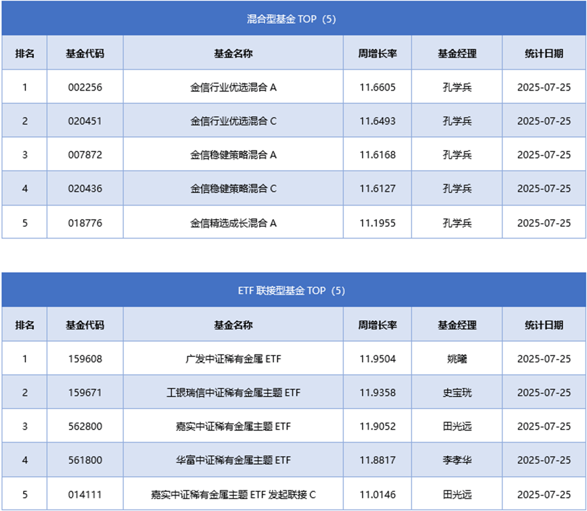 单基金方面,剔除掉创新封基类型基金的影响,上周业绩表现最好的基金为广发中证稀有金属ETF,周涨跌幅为11.9504%,为ETF型基金;分基金类型看,同样剔除掉分级杠杆及固定收益两类基金的影响,股票型基金冠军为华宝中证稀有金属指数增强发起A,周涨跌幅为10.9153%;债券型基金冠军为华商可转债债券A,周涨跌幅为5.6912%; 混合型基金冠军为易方达北交所精选两年定开混合A,周涨跌幅为24.0155%; 货币型基金冠军为天治天得利货币B,周涨跌幅为0.0491%;ETF型基金冠军为广发中证稀有金属ETF,周涨跌幅为11.9504%;LOF型基金冠军为国联中证煤炭指数A,周涨跌幅为9.4521%;QDII基金冠军为华夏野村日经225ETF,周涨跌幅为5.0151%;下面是不同类型基金周涨跌幅TOP5 (剔除掉分级基金的影响)