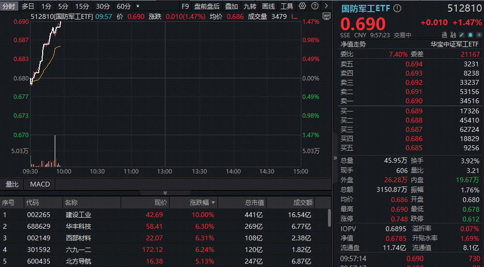 热门ETF方面,代码有“八一”的国防军工ETF(512810)场内价格快速拉涨逾1%,实时成交超3100万元。
