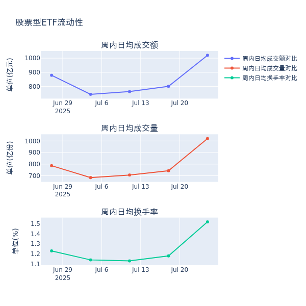流动性方面,上周股票型ETF市场日均成交额增加27.3%,日均成交量增加37.5%,换手率增加0.34%。