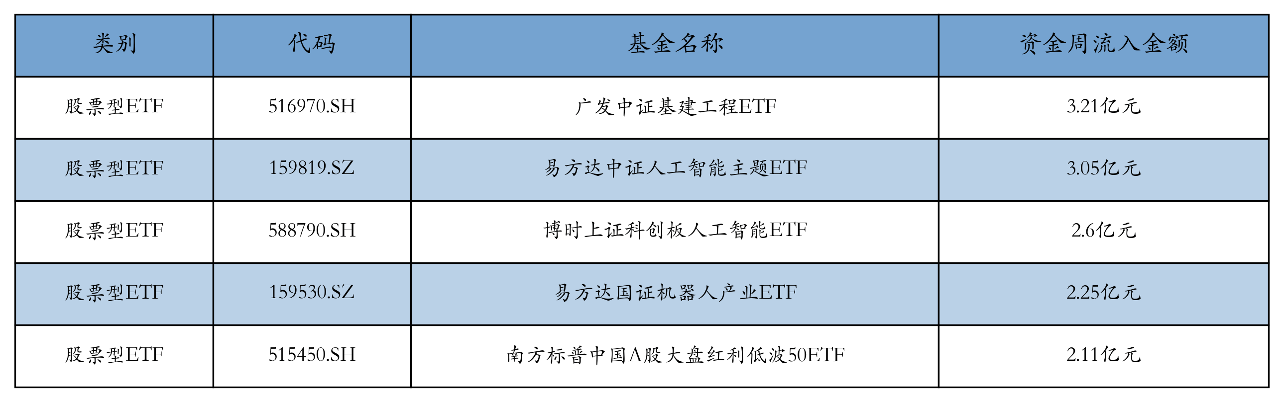 上周股票型ETF资金流入最多的5只ETF及其流入金额分别为:广发中证基建工程ETF(流入3.21亿元)、易方达中证人工智能主题ETF(流入3.05亿元)、博时上证科创板人工智能ETF(流入2.6亿元)、易方达国证机器人产业ETF(流入2.25亿元)、南方标普中国A股大盘红利低波50ETF(流入2.11亿元)。详情见下表:
