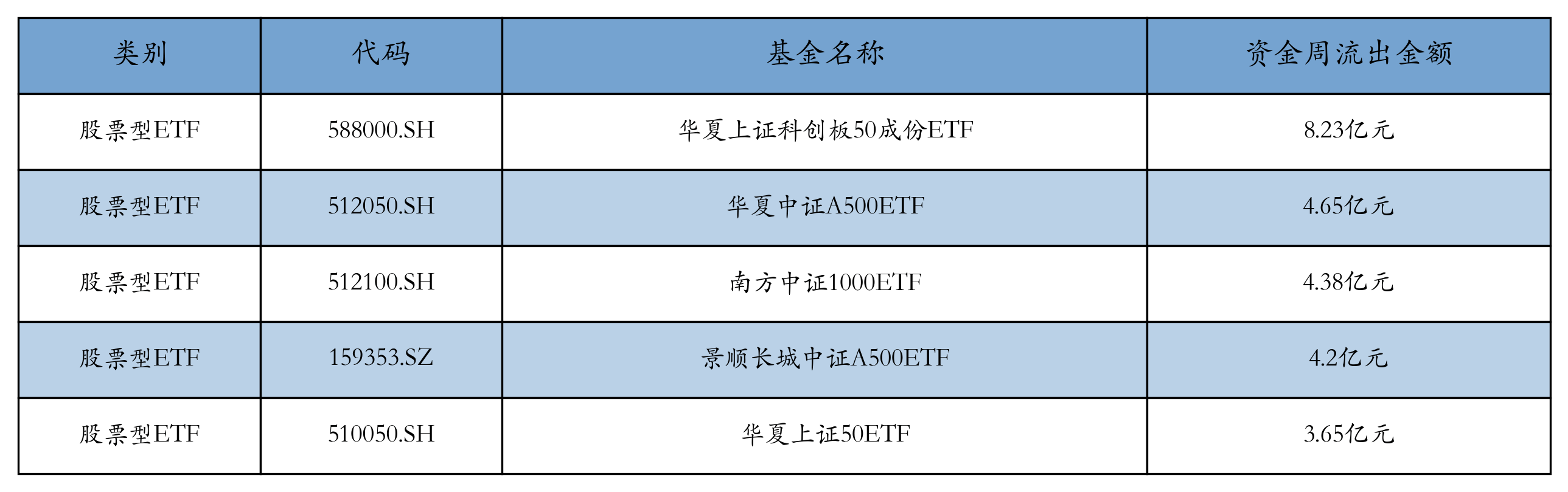 上周股票型ETF资金流出最多的5只ETF及其流出金额分别为:华夏上证科创板50成份ETF(流出8.23亿元)、华夏中证A500ETF(流出4.65亿元)、南方中证1000ETF(流出4.38亿元)、景顺长城中证A500ETF(流出4.2亿元)、华夏上证50ETF(流出3.65亿元)。详情见下表:
