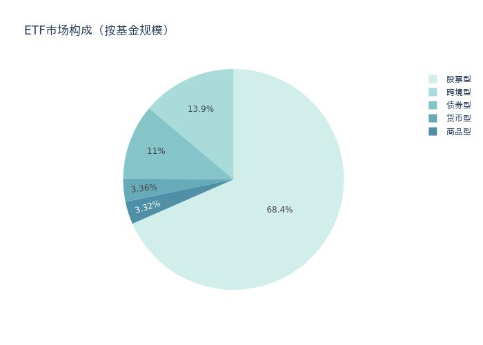 基金规模方面,上周ETF市场总规模达到46278.58亿元,较前一周增加881.93亿元。其中,股票型ETF为31670.36亿元,债券型ETF为5096.69亿元,货币型ETF为1556.84亿元,商品型ETF为1536.6亿元,跨境型ETF为6418.09亿元。