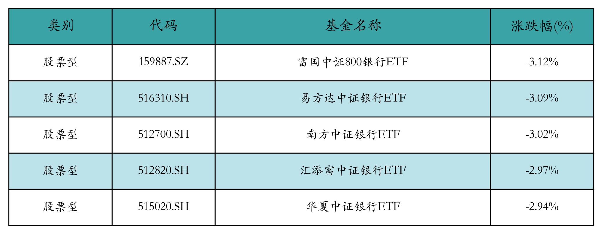 上周股票型ETF跌幅最大的5只ETF及其收益率分别为:富国中证800银行ETF(-3.12%)、易方达中证银行ETF(-3.09%)、南方中证银行ETF(-3.02%)、汇添富中证银行ETF(-2.97%)、华夏中证银行ETF(-2.94%)。详情见下表: