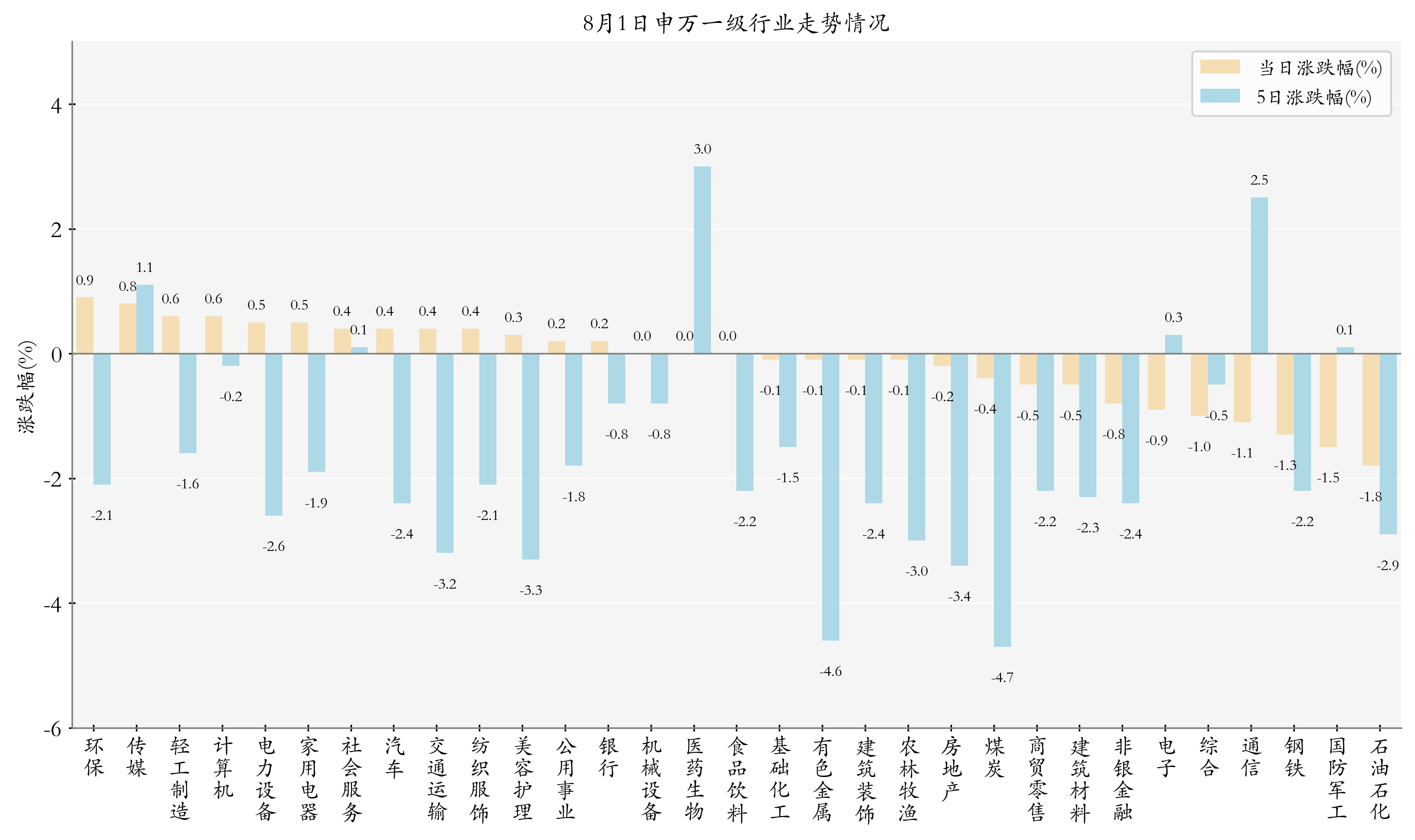 统计今日全部申万一级行业涨跌幅情况,环保、传媒与轻工制造今日走势排名靠前,日涨跌幅分别为0.88%、0.82%与0.65%,石油石化、国防军工与钢铁的走势排名靠后,日涨跌幅分别是-1.79%、-1.47%与-1.26%;近5个交易日医药生物、通信与传媒的走势排名靠前,近5日涨跌幅分别为2.95%、2.54%与1.13%,煤炭、有色金属与房地产的走势排名靠后,近5日涨跌幅分别为-4.67%、-4.62%与-3.43%。