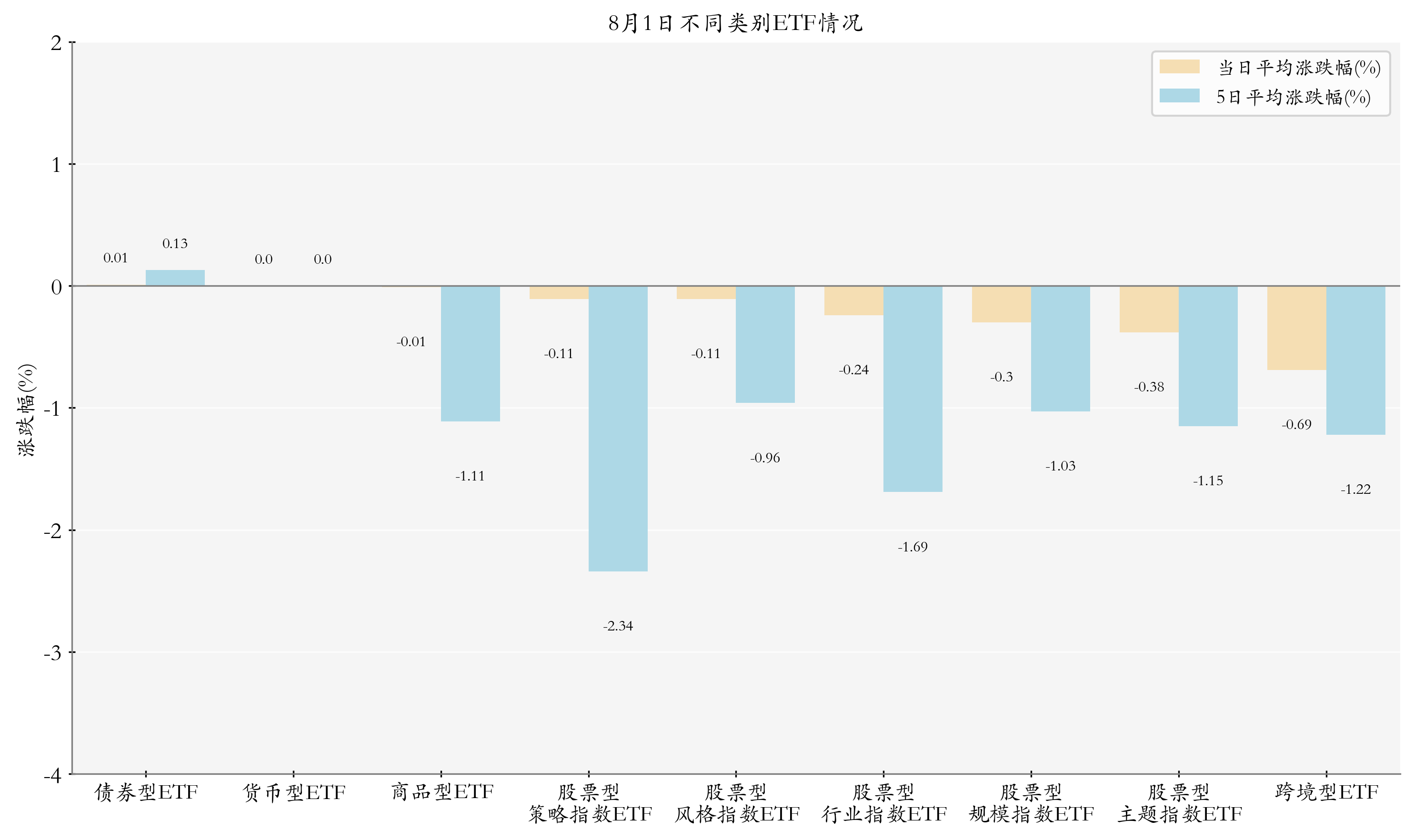根据ETF基金的规模和涨跌幅计算得出不同分类情况下各类ETF基金的平均涨跌幅。