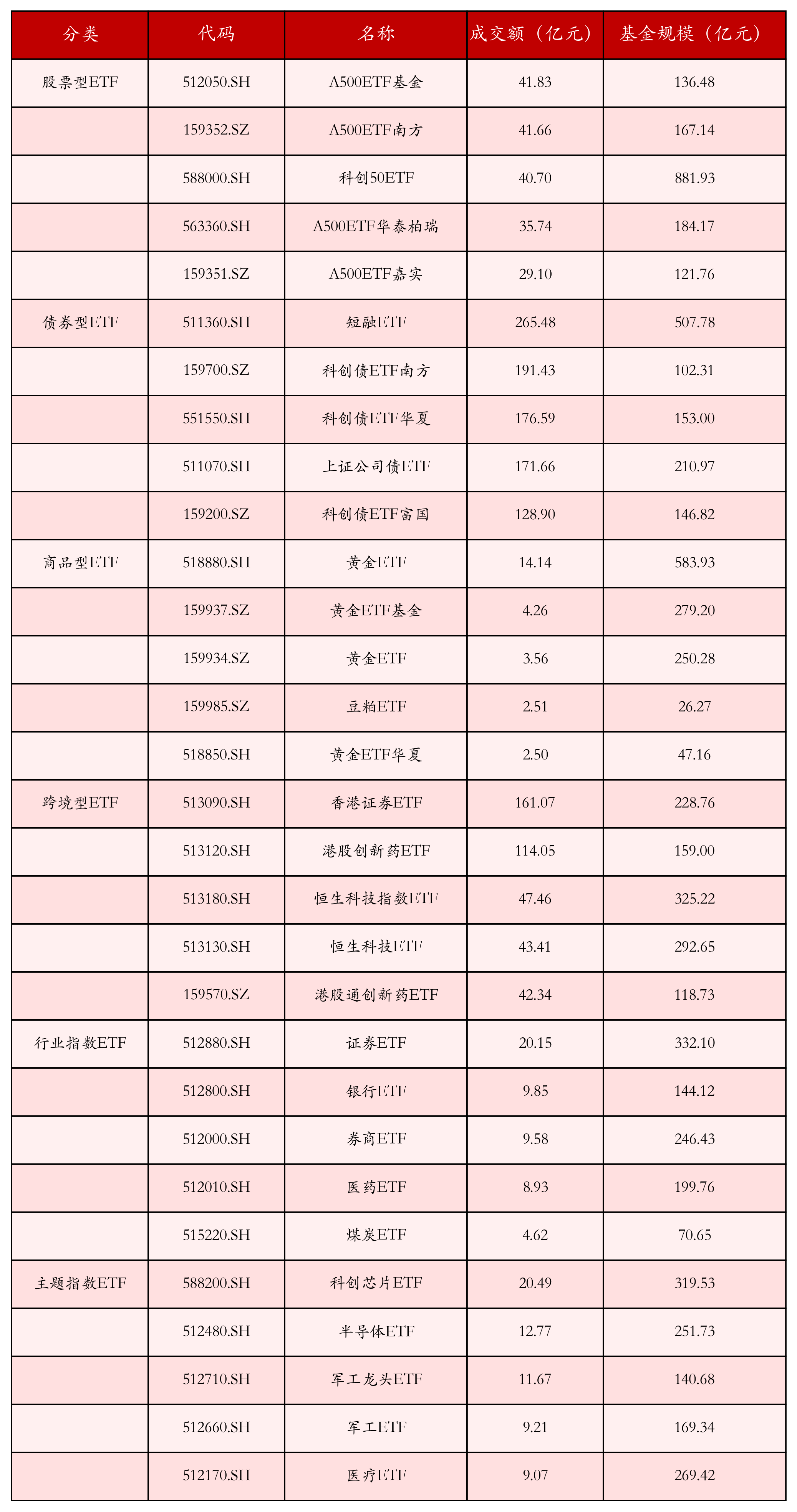 基于成交额对各类ETF今日的成交情况进行统计,成交额靠前的ETF产品如下表所示。股票型ETF中成交额排名前3位的ETF产品分别为A500ETF基金(512050.SH)、A500ETF南方(159352.SZ)和科创50ETF(588000.SH),今日成交额分别为41.83亿元、41.66亿元和40.70亿元。