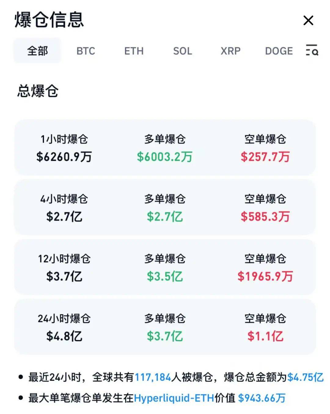 CoinGlass数据显示,截至发稿,加密货币市场超11万人爆仓,爆仓总金额达4.75亿美元。