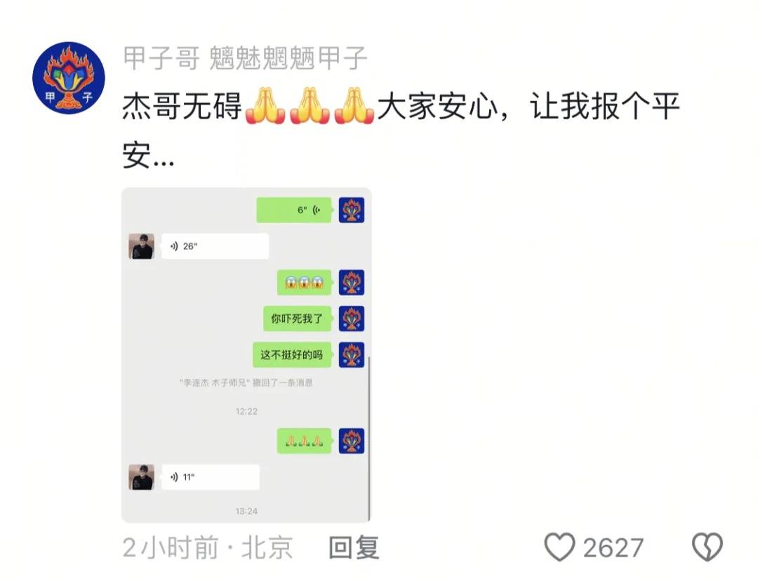 17日下午,据向阳视频,好友甲子哥在评论区晒出与李连杰聊天称,杰哥无碍,大家安心,让我报个平安。并还回复网友称,李连杰能吃能喝,很顺利,很快和大家见面。