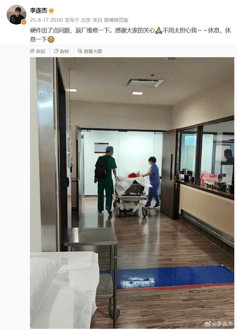 17日晚,李连杰本人晒医院照报平安:“硬件出了点问题,返厂维修一下。感谢大家的关心。不用太担心我~~休息,休息一下。”