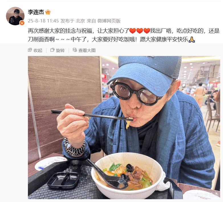 只见他晒出大口吃面的照片写道:“再次感谢大家的挂念与祝福,让大家担心了。我出厂咯,吃点好吃的,还是刀削面香啊~~~中午了,大家要好好吃饭哦!愿大家健康平安快乐。”