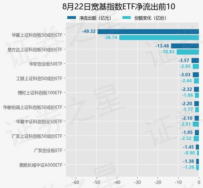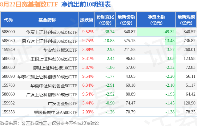 当日有128只宽基指数ETF基金出现资金净流出,其中净流出排首位的是华夏上证科创板50成份ETF(588000),份额减少了38.74亿份,净流出额为49.32亿元。