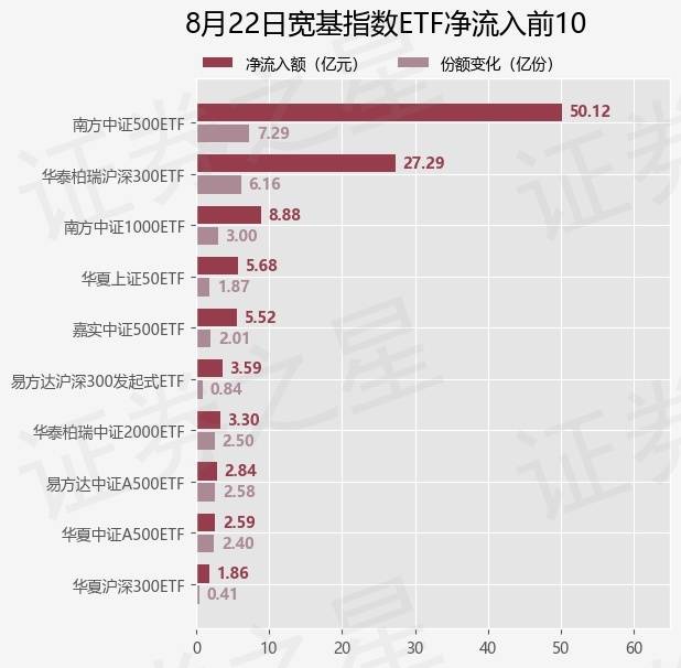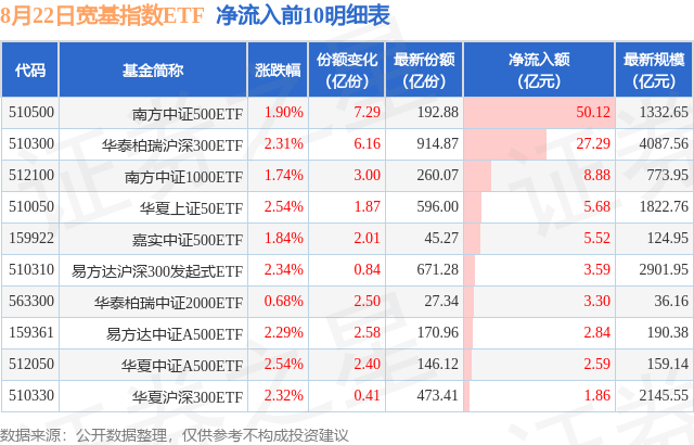 当日有83只宽基指数ETF基金出现资金净流入,其中净流入排首位的是南方中证500ETF(510500),份额增加了7.29亿份,净流入额为50.12亿元。