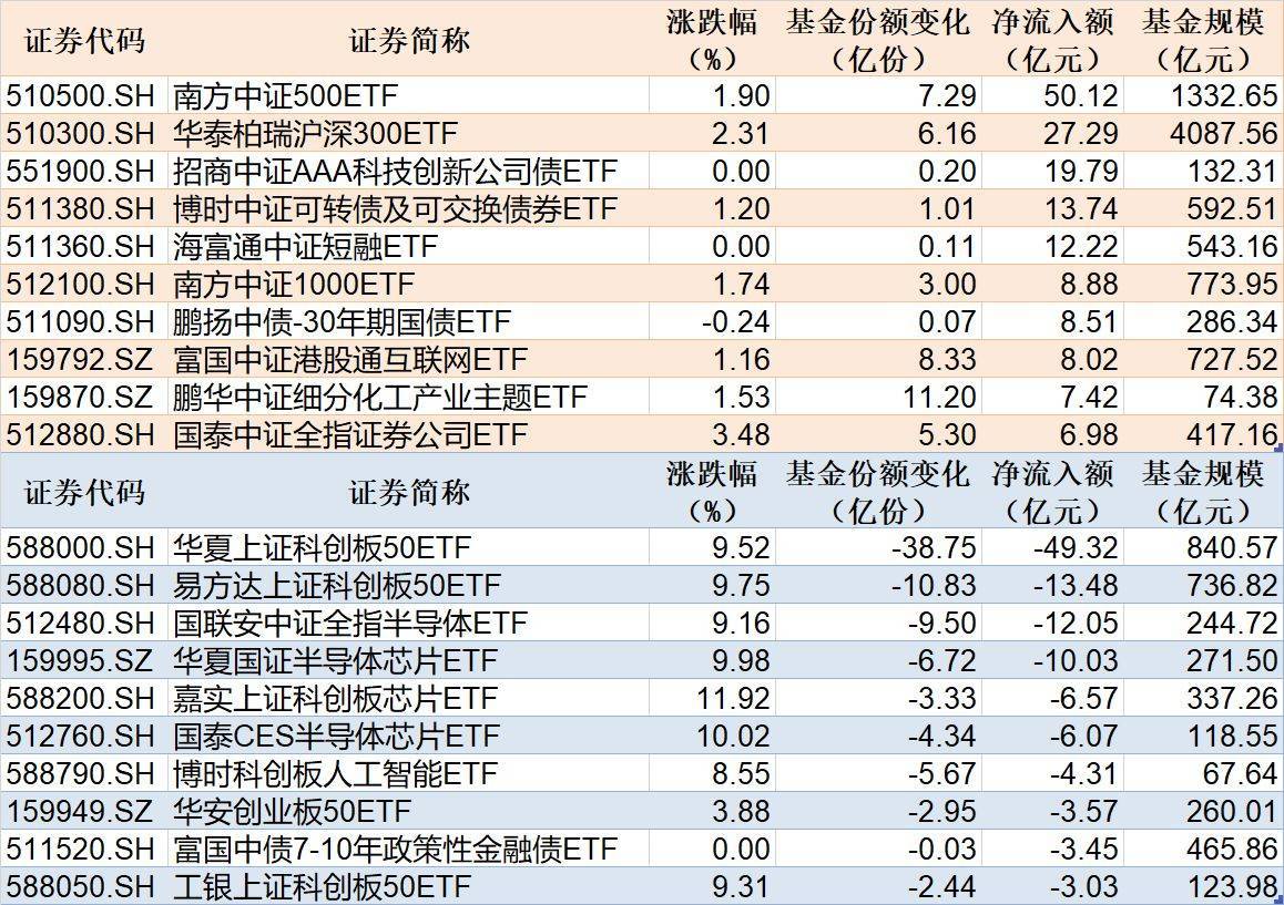 与此同时,华夏上证科创板50ETF份额减少38.75亿份,净流出额49.32亿元;易方达上证科创板50ETF份额减少10.83亿份,净流出额13.48亿元;国联安中证全指半导体ETF份额减少9.50亿份,净流出额12.05亿元。
