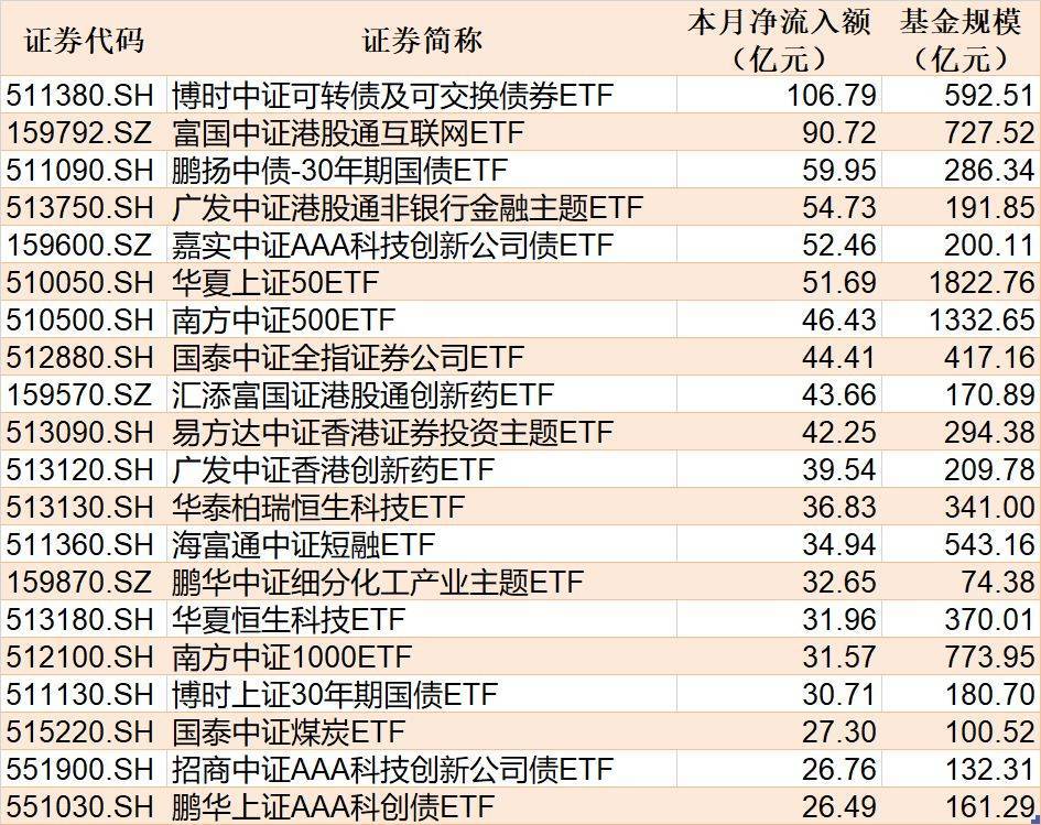 截至8月22日,8月资金净流入额居前20的ETF名单如下: