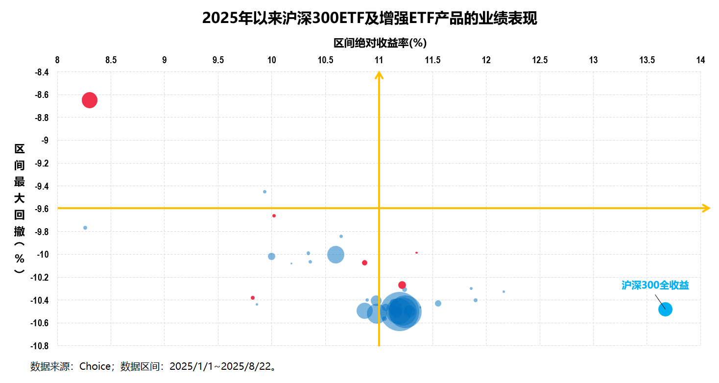为了方便对比,图中除了沪深300增强ETF(红色点所示,下同)之外,同时还展示了沪深300ETF(蓝色点所示,下同)以及沪深300指数(天蓝色点所示,下同)的收益回撤情况。点的大小代表规模(下同)。