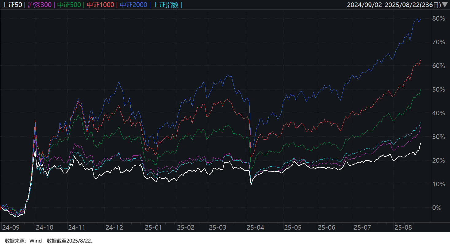 有鉴于此,下文的讨论我们主要以数量较多的宽基型增强ETF为例,且忽略只有个别1-2只产品的“其他”宽基增强ETF(等以后发展壮大了我们再来做讨论),主要聚焦于数量较多的跟踪主流宽基指数的增强ETF,主要包括沪深300、中证500、中证1000和中证2000这四个指数。中证A500的增强ETF基本都成立于今年,且其与沪深300相似度较高,所以这里也不再单独做讨论。