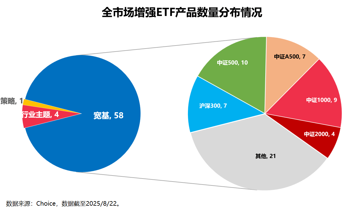从跟踪指数的类型来看,宽基型增强ETF占绝对优势,行业主题和策略型增强ETF几乎可以忽略不计。