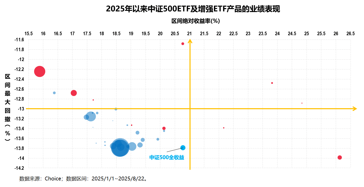 中证500增强ETF相对于纯被动跟踪的常规中证500ETF具有相对明显的“增强”效果,整体来看,收益层面多数中证500增强ETF对主流中证500ETF都有一定的超额(红色点多数位于蓝色点聚集的部分右侧),其中个别几只的超额十分显著,最多一只今年以来的超额达到6-7个点;而即便是收益层面不占优的几只中证500增强ETF,其在回撤层面也是明显好于大多数中证500ETF。