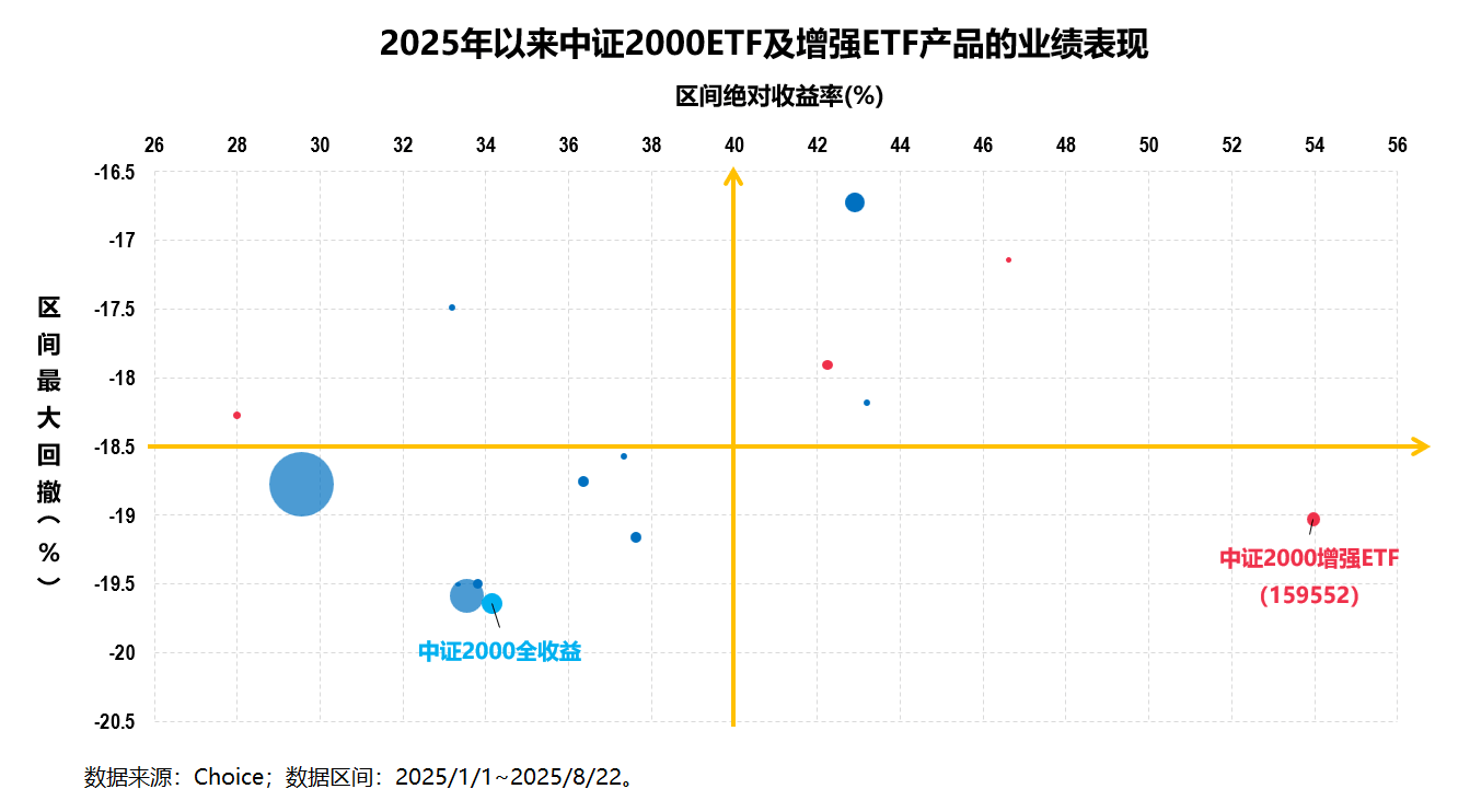 比如中证2000增强ETF(159552.SZ),不仅超额能力极强(如前所述其相较于市场主流中证2000ETF的超额超过20个点),其在今年以来的绝对收益上更是超过50%,收益冠绝全市场所有宽基ETF。