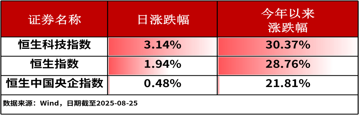 8月25日,港股主流指数集体收涨。其中,恒生科技指数上涨3.14%,涨幅相对居前。