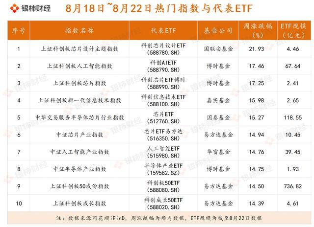 多只国产算力芯片股上周股价连创新高,其中寒武纪-U(688256.SH)股价突破1200元,海光信息(688041.SH)上周五20cm涨停,市值突破4000亿元。这一板块的大爆发,带动多只芯片主题ETF大幅上涨,其中国联安基金旗下的科创芯片设计ETF涨幅达21.93%,还有多只半导体主题、人工智能主题ETF上周均涨超15%。