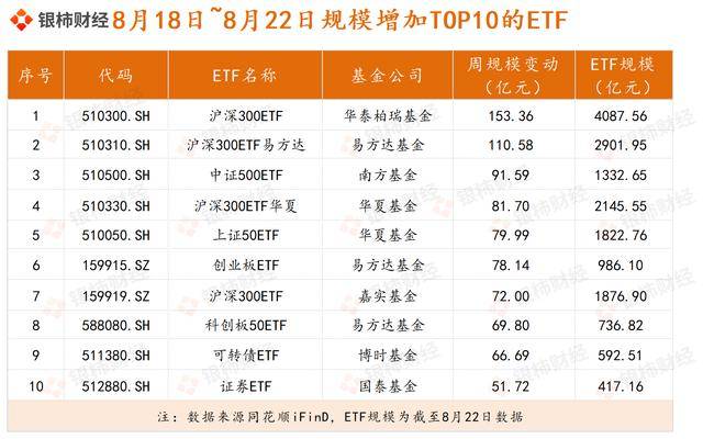 此外,同花顺iFinD数据显示,截至8月22日,市场上共有100只百亿级ETF,数量创历史新高。其中规模超500亿元的ETF有16只,这其中又有6只ETF规模已突破千亿元。华泰柏瑞基金、易方达基金和华夏基金旗下的沪深300ETF稳居规模榜前三名,截至8月22日规模分别为4087.56亿元、2901.95亿元和2145.55亿元。