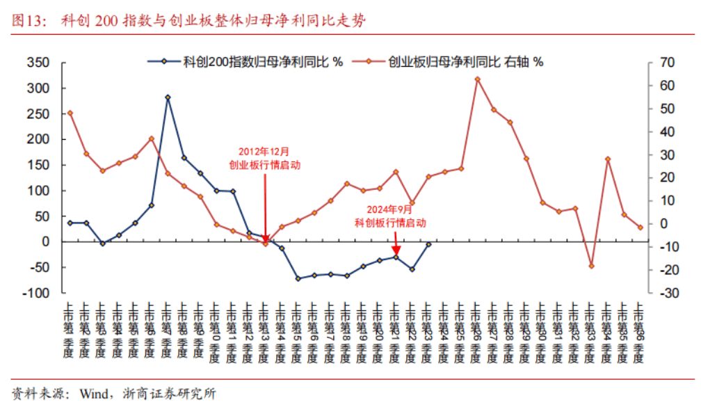 结合科创板的盈利情况和股价走势,对其而言,2024年9月是预期驱动的行情,经历了震荡之后,浙商证券认为,科创板自今年6月以来进入主升段,主升段也是行情主要上涨阶段,核心驱动在于AI和创新药的产业景气提升。进一步借鉴创业板历史,结合盈利释放阶段、股价上涨位置、基金配置水平等指标,科创板整体处于主升段的初级阶段,类似于2013年Q3附近。