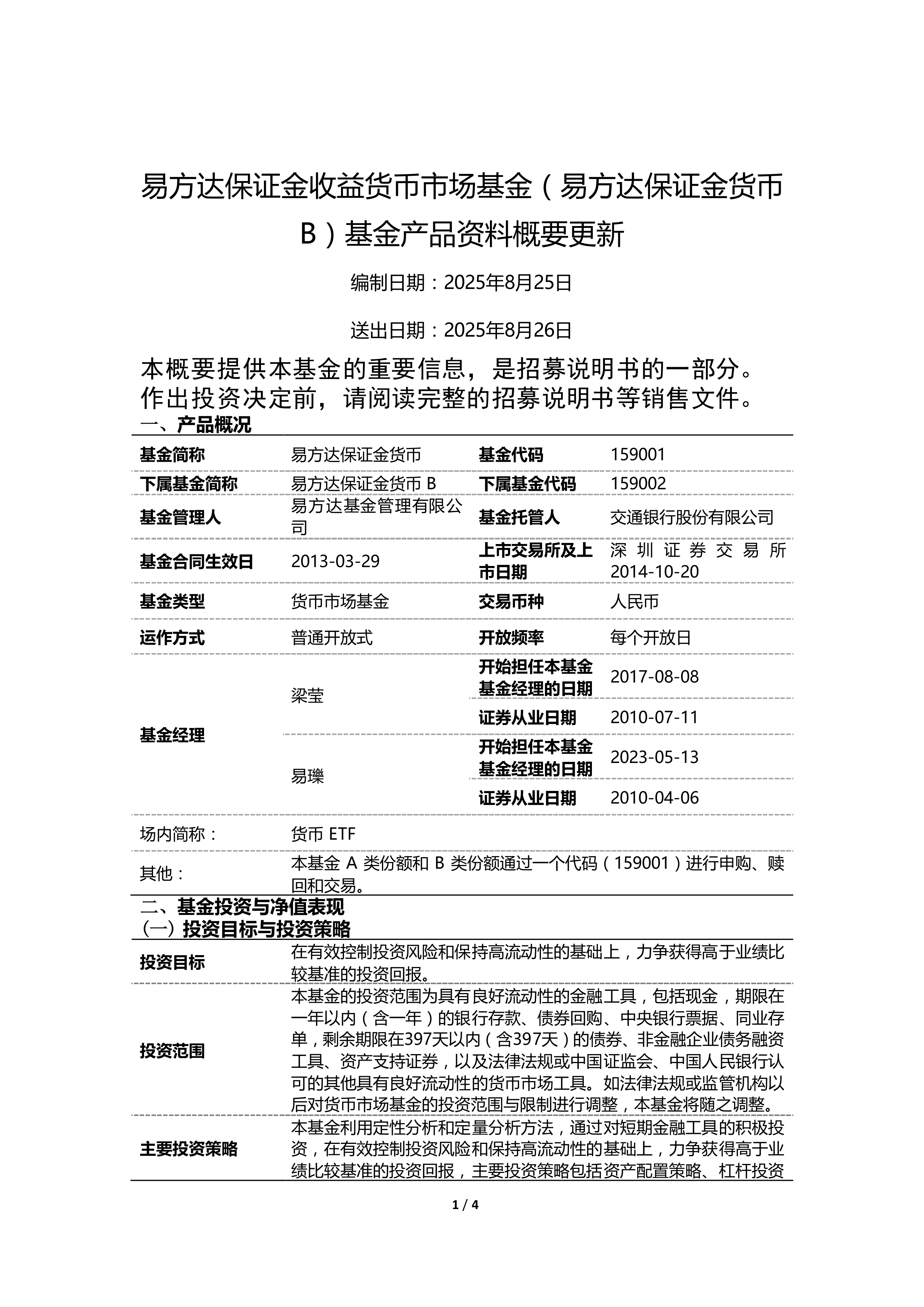 基金-货币ETF-易方达保证金收益货币市场基金(易方达保证金货币B)基金产品资料概要更新