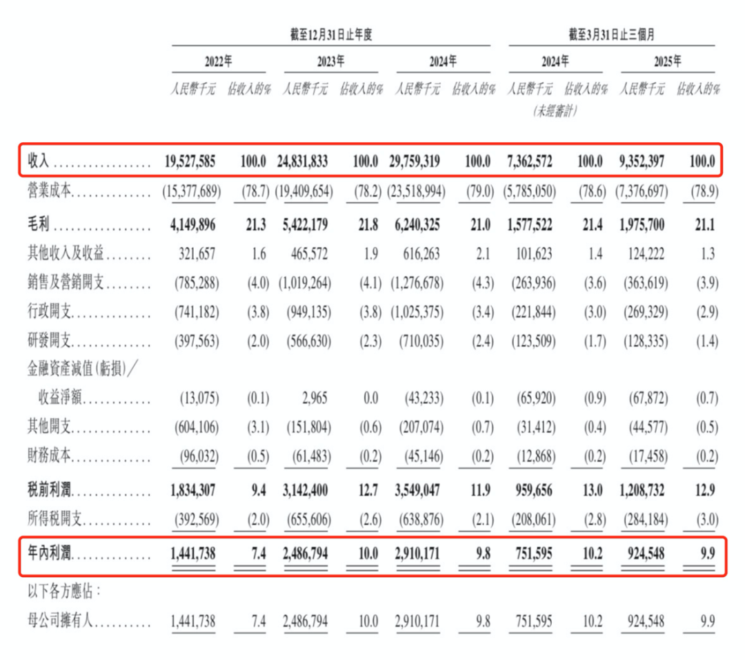 财务数据显示:公司收入从2022年的195.28亿元增长到2024年的297.59亿元人民币,复合年增长率23.4%。净利润增长更快,从2022年的14.42亿元增至2024年的29.10亿元,复合增长率42.1%。