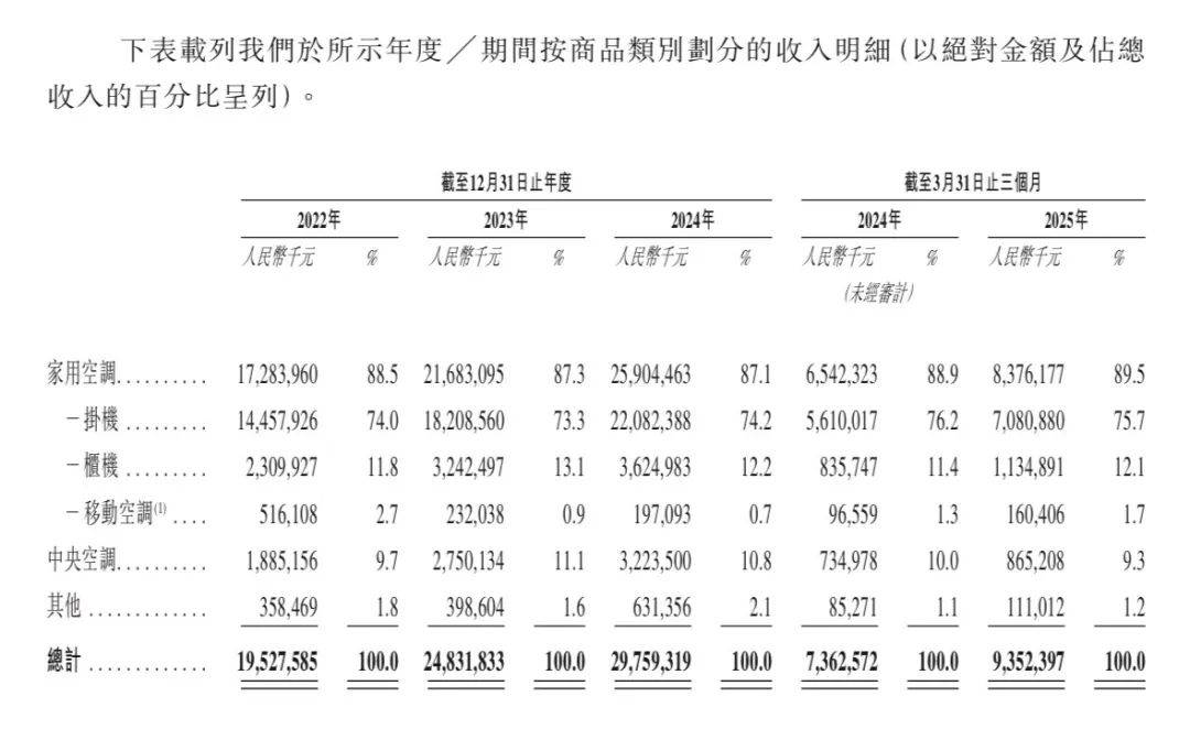 家用空调是公司绝对营收主力,2025年一季度占比89.5%,在挂机、柜机和移动空调三大品类中,挂机贡献了75.7%的营收。中央空调占比9.3%,虽然占比不高,但毛利率更高(>30%)。