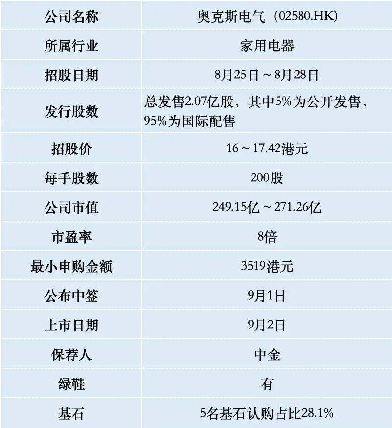 奥克斯电气本次IPO发行股份占全部股份比例的13.3%,按招股价中位数16.71港元算,募资约34.6亿,5名基石投资者锁定9.7亿,流通盘24.9亿港元,这个流通盘太大了。