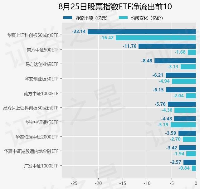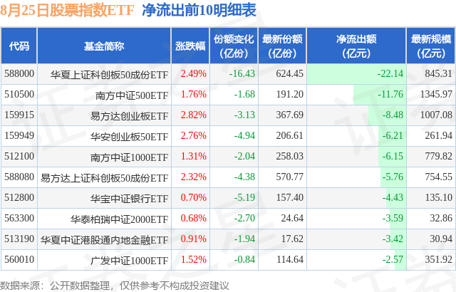 当日有373只股票指数ETF基金出现资金净流出,其中净流出排首位的是华夏上证科创板50成份ETF(588000),份额减少了16.43亿份,净流出额为22.14亿元。