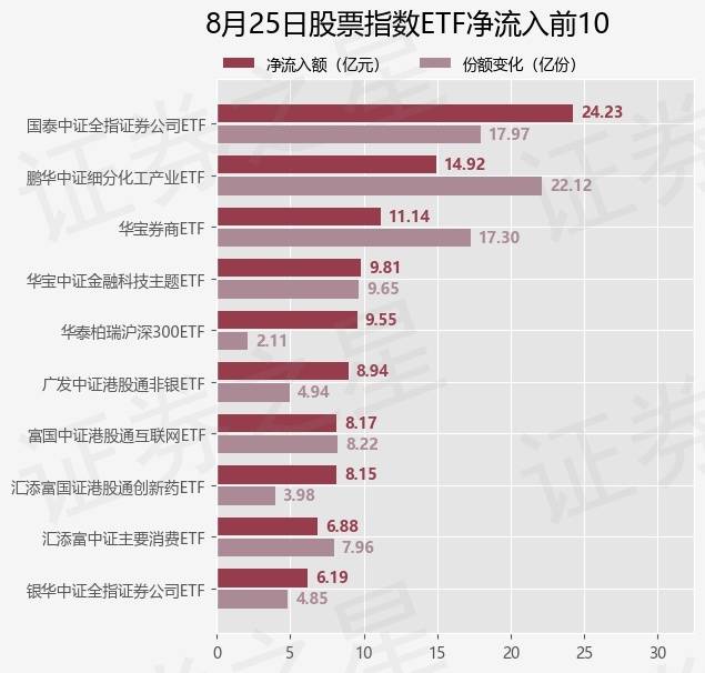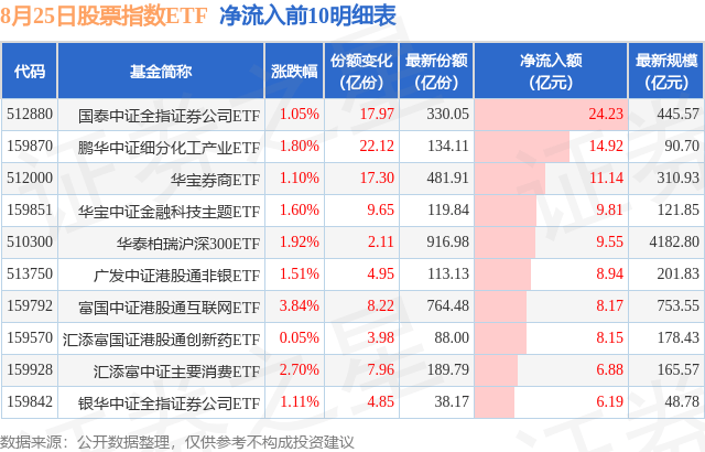 当日有413只股票指数ETF基金出现资金净流入,其中净流入排首位的是国泰中证全指证券公司ETF(512880),份额增加了17.97亿份,净流入额为24.23亿元。